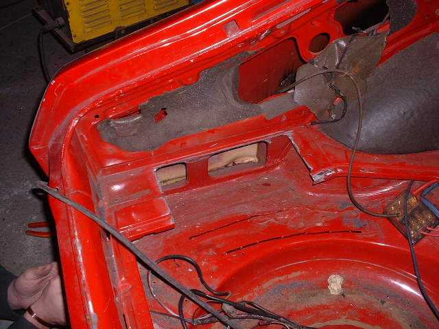 Boot area stripped waiting to be cut up, Area where battery will sit is removed.