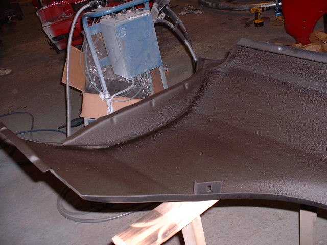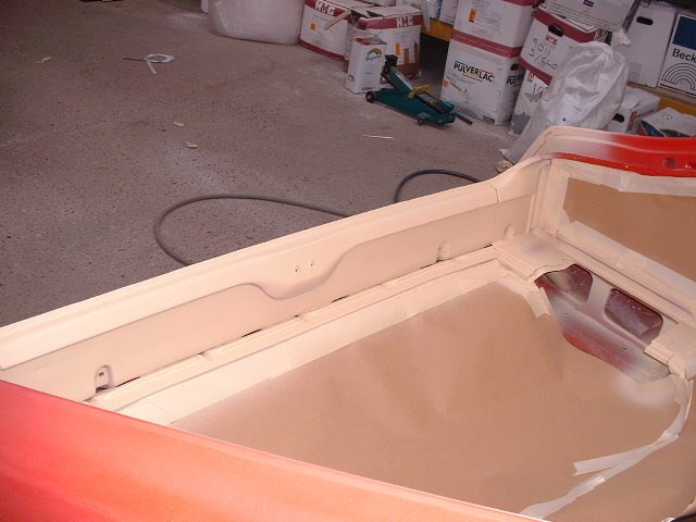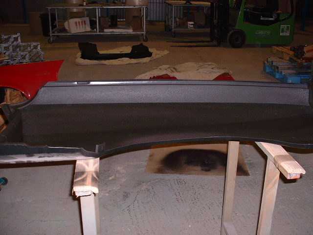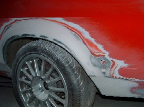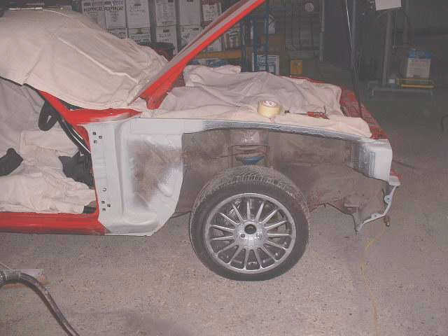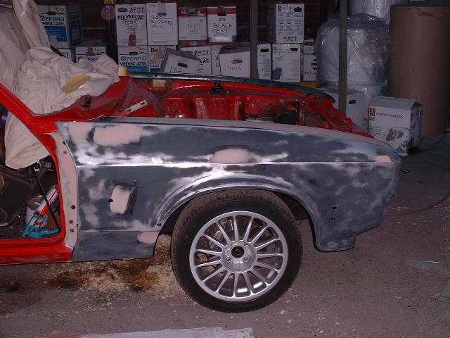 Second shot of prepped shell. First coat of filler primer on new rear arch.