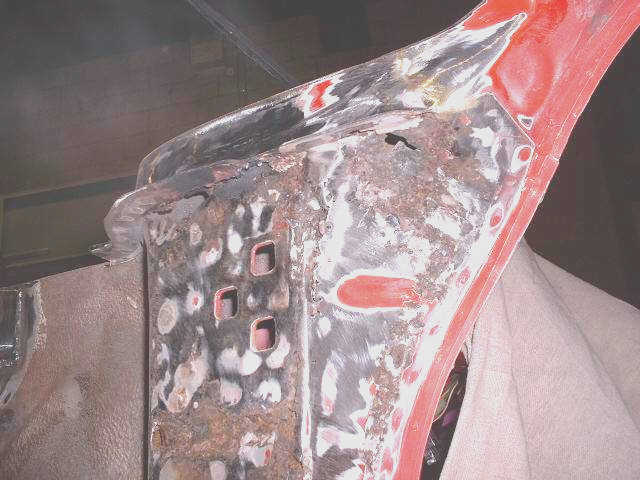 The A pillar is nearly disappeared due to corrosion, the screen scuttle has rusted and the wing rail has corroded like on drivers side.