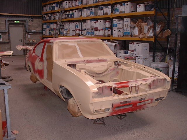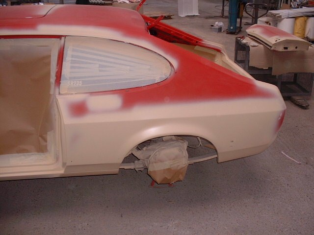Car waiting for masking up The body shell with wheels removed, and wiped down with panel wipe and masked up waiting for filler primer.