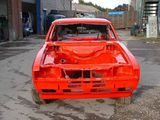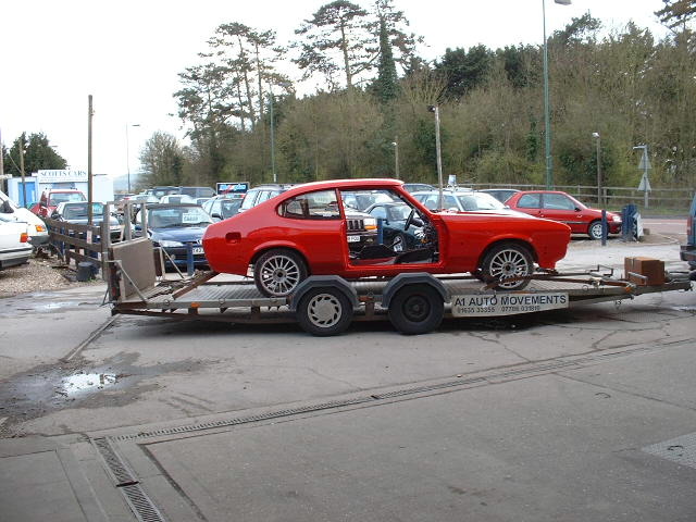 Front shot of painted shell. Car on trailor (kindly donated by A1 Auto Movements) ready for the trip home.